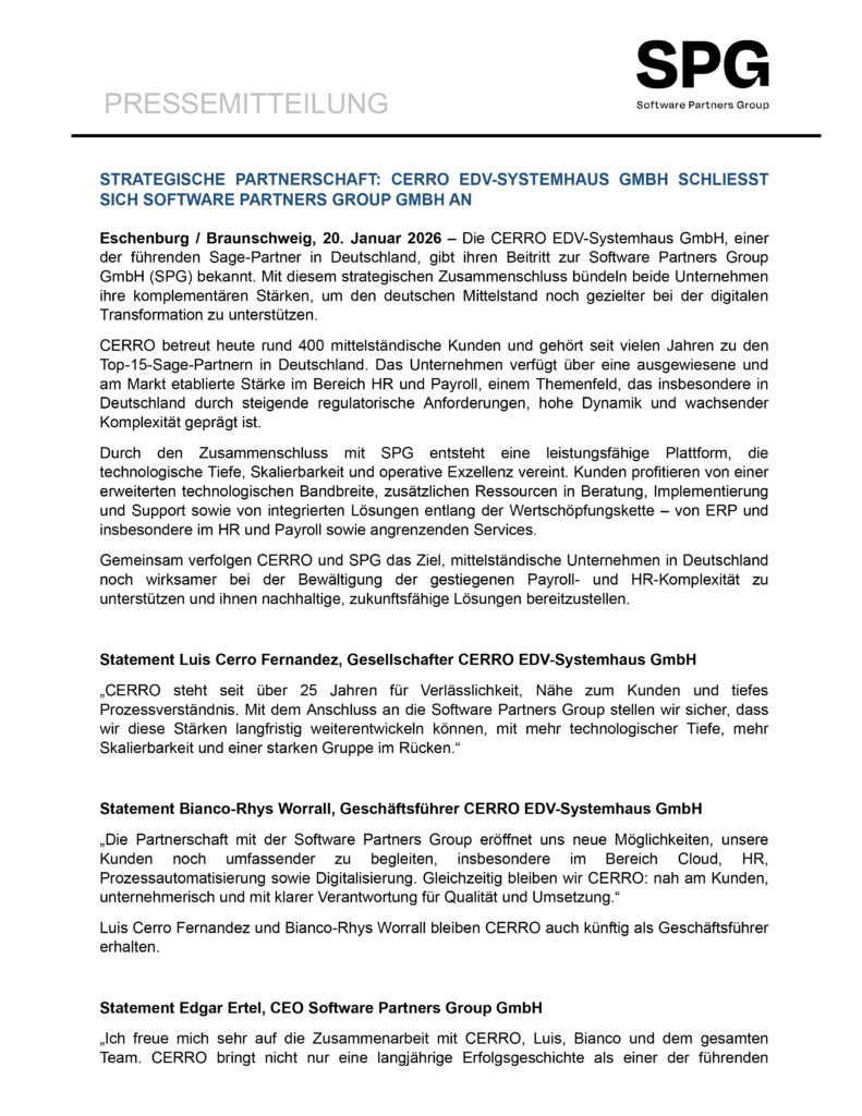 Eschenburg / Braunschweig, 20. Januar 2026 – Die CERRO EDV-Systemhaus GmbH, einer der führenden Sage-Partner in Deutschland, gibt ihren Beitritt zur Software Partners Group GmbH (SPG) bekannt. Mit diesem strategischen Zusammenschluss bündeln beide Unternehmen ihre komplementären Stärken, um den deutschen Mittelstand noch gezielter bei der digitalen Transformation zu unterstützen.